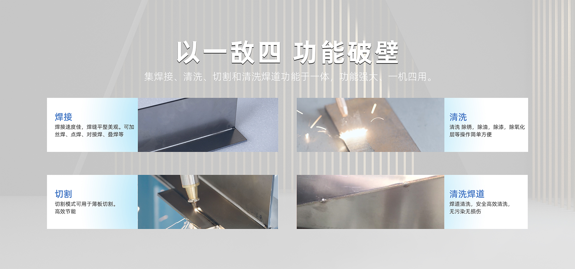 集焊接、清洗、切割和清洗焊道功能于一體,功能強大、一機四用。